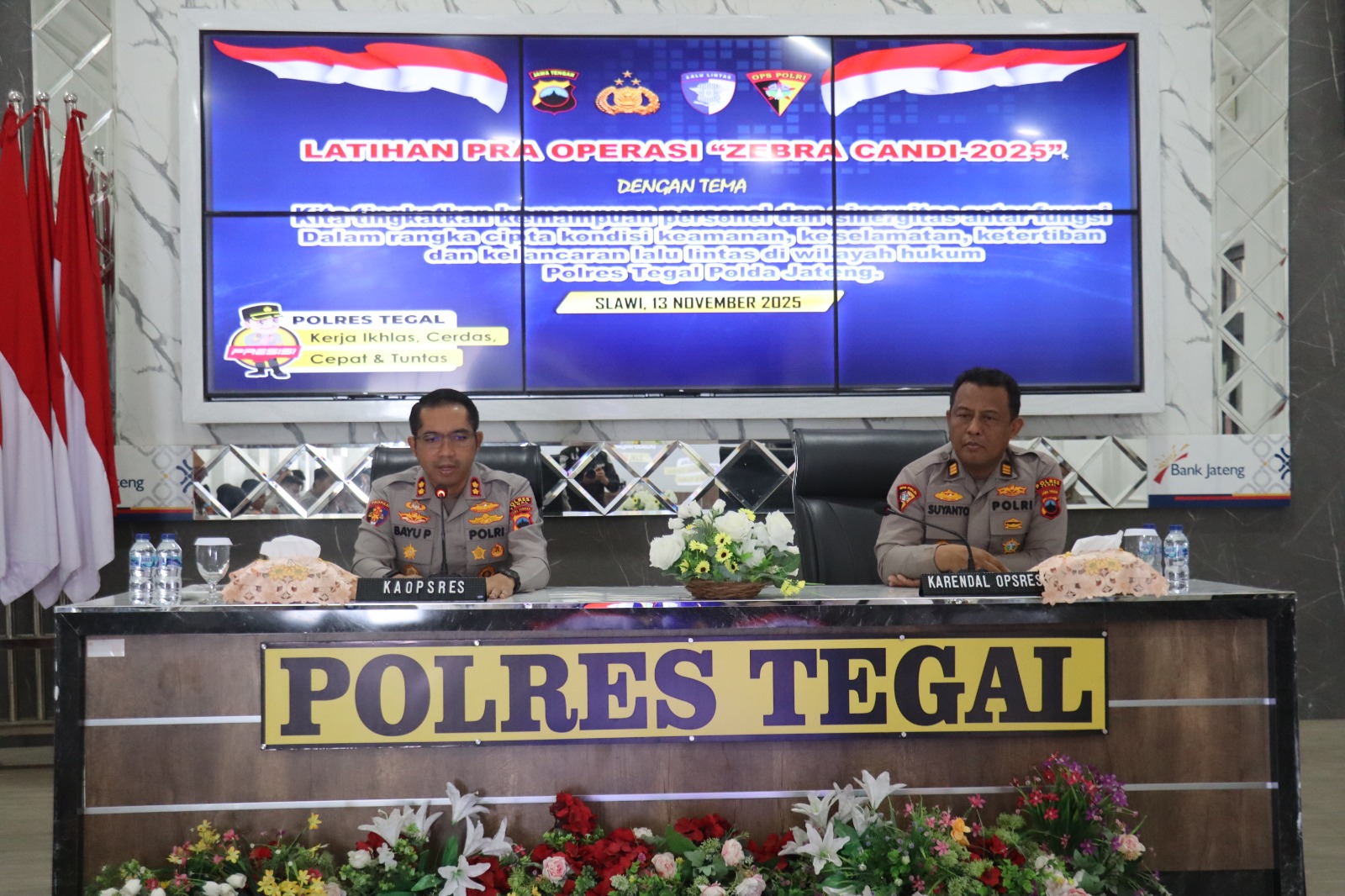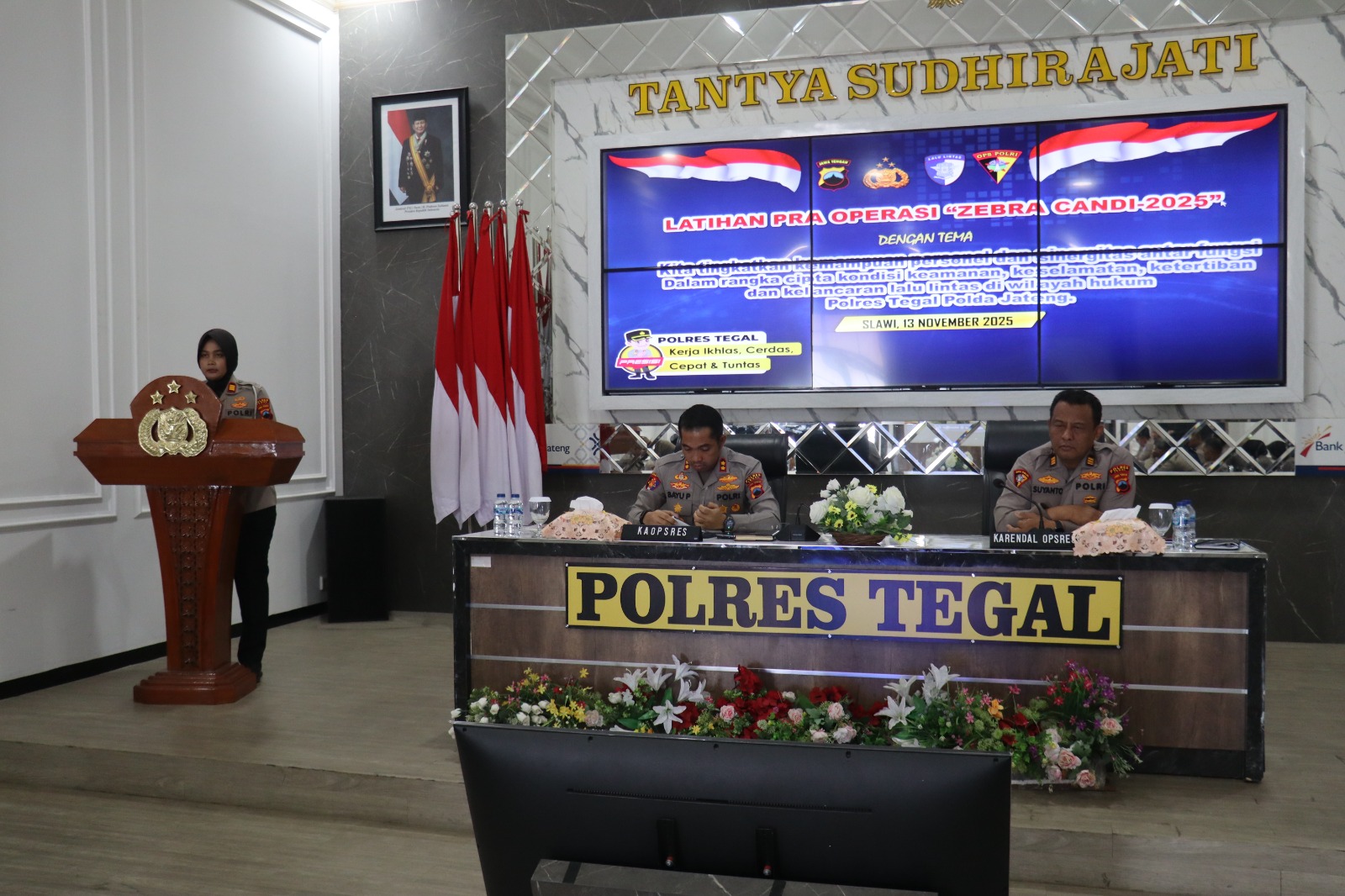 Polres Tegal menggelar kegiatan pelatihan pra operasi (Latpraops) dalam rangka Operasi Zebra Candi 2025 di Gedung Tantya Sudhirajati, Rabu (13/11/2025). Sebanyak 77 personel yang tergabung dalam perangkat maupun satuan tugas (Satgas) mengikuti kegiatan ini. Latpraops dilaksanakan untuk memantapkan kesiapan personel sebelum pelaksanaan operasi di lapangan.