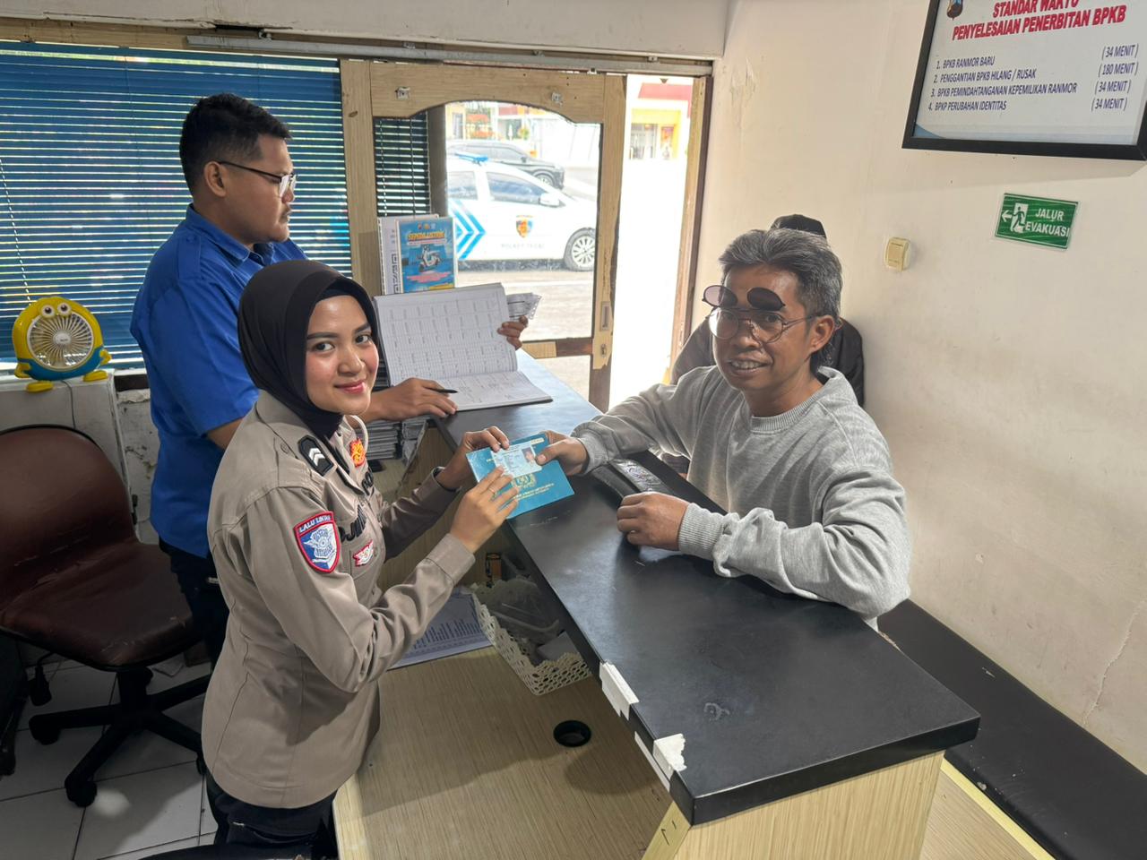 Di ruang pelayanan, para petugas berseragam memberikan pendampingan langsung kepada pemohon, mulai dari pengecekan berkas, pengisian formulir, hingga proses administrasi lanjutan. Kehadiran personel yang komunikatif dan responsif membuat warga merasa terbantu, terlebih bagi mereka yang baru pertama kali mengurus dokumen kepemilikan kendaraan.